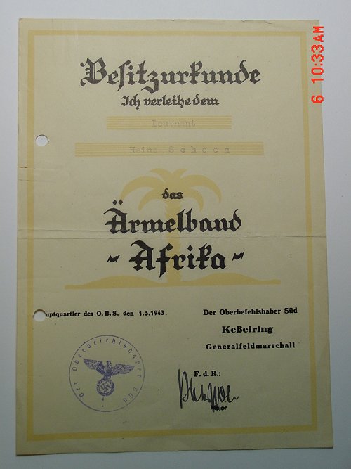 There also appears to have been a Fallshirmjäger version. It was executed in a relatively plain format. At the top, in old German text (and using upper and lower case letters) was the word "Besitzurkunde" (possession/presentation document). The use of this word is fairly unusual, as most documents carry the title 'Besitzzeugnis' (possession/presentation evidence) instead. Directly underneath is the phrase "Ich verleihe dem" (I award) followed by two blank lines - the top line for entering the recipient's rank and name, the bottom - and shorter line, for entering the recipient's unit. The words 'Armelband "Afrika"' came next under, with the quote marks around the word AFRIKA being executed on the top ends of the word rather than in accordance with German grammar that typical has the lead quote at the bottom. Toward the lower left corner are the words: "Hauptquartier des O.K.S" in a plain font, followed by a blank underline for typing in the date. The Germans used several styles to record dates. For example, the 25th of May 1943 could be written as 25. Mai 1943 or 25.5.43. Other variations are possible based on how diligent or attentive the clerk typist was. Continuing to the right toward the opposite side of the document and on line with the previous left entry were several lines of printing. The top line was "Der "Oberbefehlshaber Süd", followed underneath by "Keßelring" and under this his rank: "Generalfeldmarschall", with room for signature in between. Lastly, on the right, under Kesselring's printed signature block is the entry: "F.d.R:". The official signing for Kesselring signed with his last name under this entry. Again, the person signing many of these was this Major Pfeffer. Under his signature is printed his grade "Major" in a very small sized font. On occasion, one will find these documents signed by others with the appropriate printed (not typed) rank of the individual, for example "Leutnant I.a."