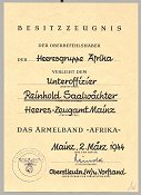 Heer formal documents were also in DIN A5 size, but were different in presentation. Besides the different format and wording, the Heer used a fill-in-the-blank reminder under each line requiring an entry to be manually put in. Starting at the top was the more commonly seen word "BESITZZEUGNIS" printed in Roman lettering, using double spaces between the letters and all caps. Next, under this were the words "DER OBERBEFEHLSHABER", again in all caps using the same font but of a smaller size. This was followed on the next line by the word "DER" and space for typing in the unit from which the recipient was assigned at the time he became authorized the award. This is usually typed in with "Heeresgruppe "AFRIKA"'. Underneath was the line, in all caps "VERLEIHT DEM" and a blank drawn line for typing in the recipient's rank. In a small size font, and enclosed parenthesis, under the blank drawn line was a reminder to the clerk preparing the document that this was the place to record the rank: the word "(Dienstgrad)". Following this, and underneath was a blank line for typing the name, that is: "(Vor und Zuname)". The next line was a similar space for recording the unit of the recipient "(Truppenteil)". Then came the title of the award: "DAS ARMELBAND >>AFRIKA<<". Some Heer examples will have typed in above this the words "mit Wirkung vom" (in effect from) and a blank space for recording the date and location of presentation manually, with the typical reminder of this style document: "(Ort Und Datum)". The locations are usually a city somewhere on the European continent/Germany proper. However, on occasion - and as was very common with many other kinds of award documents - the abbreviation O.U., for Ortsuntekunft (meaning somewhat literally 'place of the quarters' - but figuratively 'at the field headquarters, wherever that was at the time'). Toward the bottom of the document was another blank line provided for the authorizing official's signature: "(Unterschrift)", rank and duty title: "(Dienstgrad und Dienststellung)" - for service grade/rank and service position. Last, in the lower left was a doted in circle that guided the preparer in placing the unit stamp. Centered in the circle was the clerk's reminder: "(Stempel)". Pictured below is an example of an award made to an Oberfeldwebel Hektor of the Feldgendarmerie.