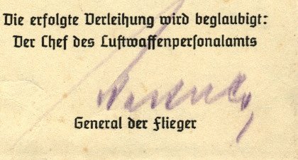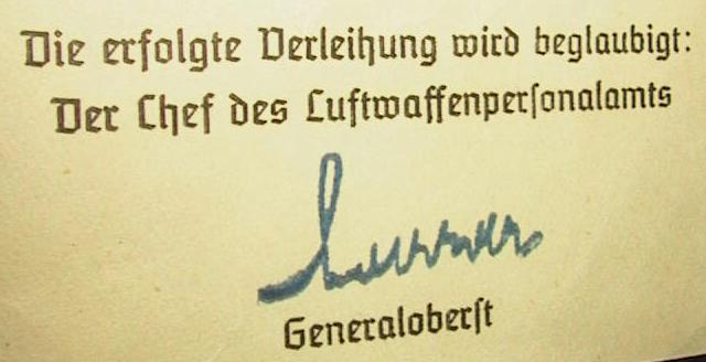 The urkunde pictured to the right is the second type which has the ink-stamped signature of the Reichsmarschall positioned centrally. This type also has a second signature which appears in the bottom right corner ... that of the Head of the Luftwaffe Personnel Department. |
