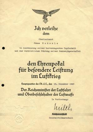 | As for many other military and civil awards of the Third Reich period, the EHRENPOKAL was accompanied by a document or "urkunde". Collectors will encounter two types of certificate. Early examples generally have Göring's original signature placed on the lower right of the document. At times these were signed on his behalf by Generalfeldmarschall Milch.