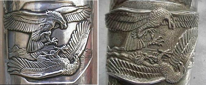 | It has been reported that more than one person has bought the type of goblet pictured in the smaller images as an ORIGINAL! (Please note that these photographs are not to scale - they can not be compared for relative size - the reproduction however is smaller than an original.) Readers may find this difficult to understand. Perhaps so ... but if one has not had the opportunity to closely examine one of these rare pieces of Luftwaffe memorabilia .... nor had access to clear, enlarged photographs .... nor realised that originals on today's market command some thousands of dollars ..............!! It is interesting to compare some of the detail of the fake (pics on the right) with an original: |