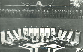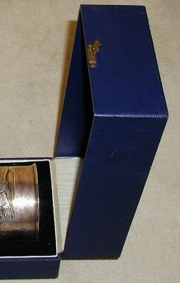 ceremony. Note the presentation boxes. When the collector encounters this very scarce accessory it will invariably be the type covered in blue leatherette, pictured below. Boxes in red, said to be early war issue, are extremely rare. |