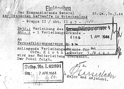 The Ehrenpokal was awarded until December 1944, but from around June 1943 the actual presentation of the goblet was less likely to occur .... Davis (1992) records that "it appeared that it was no longer possible to manufacture the required number of goblets due to the demands of the war". In these cases, however, the urkunde was presented and an appropriate entry made in the Soldbuch and Wehrpass. |