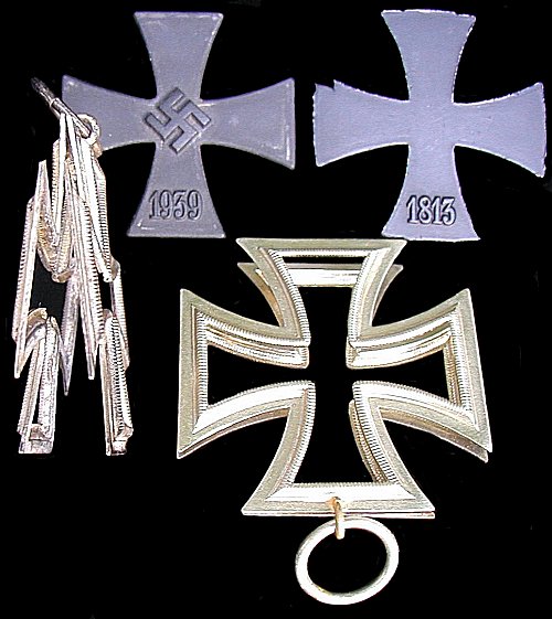 "The Knights Cross of the Iron Cross, similar to the Iron Cross I and Iron Cross II, is created as follows: The rim is made of massive silver, the black middle piece is made of iron. After both parts are combined, the rim gets bleached and the iron blackened. The carrying ring has been soldered on prior to this process. The outer rim of the silver casing gets polished, while the pearly ripped outer rim remains white.