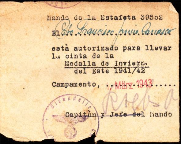 While serving with their Allies, Spanish soldiers were awarded many German decorations (General Augustin Muñoz Grandes was presented the Knights Cross for his services). Legionnaires were also eligible for the Campaign in the East award, as evidenced by the award document below.